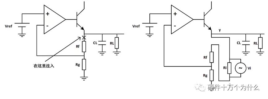 为了克服这个问题,我们必须在闭环的情况下进行测量,一种可行的手段是环路注入。下图展示了典型的环路注入方法。为了尽可能降低误差,我们对注入点的选取有特殊的要求,一般要让从注入点一端看进去的阻抗远远大于另一端看进去的阻抗,一个比较理想的注入点是 输出和反馈网络之间,其他注入点如误差放大器和功率晶体管之间也是可行的。