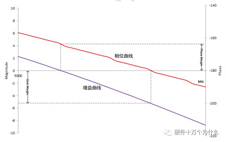 我们可以画出系统环路增益的波特图来评估系统的稳定性,表达系统稳定性常用的增益裕度和相位裕度指标一般就是从这里得出的。相位裕度指的是在增益降为1(或者 0 dB)的时候,相位距离-180°还有多少;增益裕度则是相位到达-180°的时候,增益比 1(或者 0 dB)少了多少。