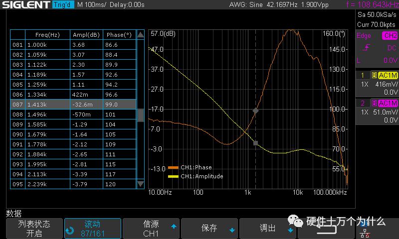 当增益曲线或者相频曲线不光滑的时候,有可能是注入电压过大或者不足导致 C1/C2 的波形失真,或者 C1/C2 电压过小导致示波器检测不出来,此时可以退出波特图看该异常频点的 C1 和 C2 的表现是否可以很好地在屏幕中看到清晰的迹线来判断。如果C1 和 C2 的迹 线不能很好地显示在屏幕上,可以根据自己需求来修改不同频段中,SAG1021I 的输出幅度。