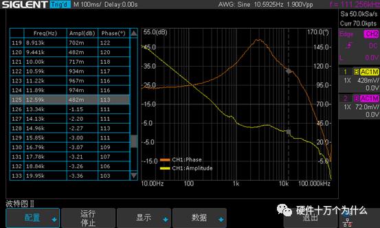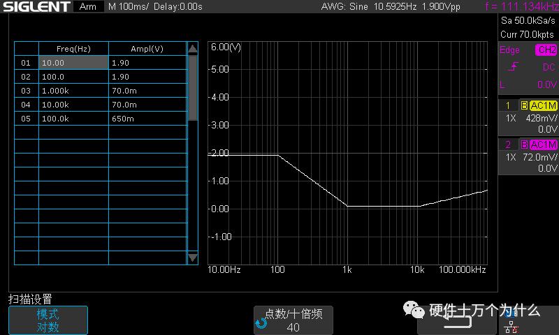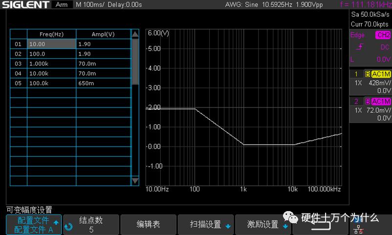 这一小节主要介绍了完成本次测量所需的关键设置,关于 BodePlot 完整的使用说明,在进入 Bode Plot 软件之前,建议先把要用到的通道设置为 20 MHz 带宽限制。本次测量的频率范围是 10 Hz 到 100 kHz,这于一个预期的穿越频率在 10 kHz 左右的电路来说足够了。在 Bode Plot 的主菜单按配置信息进入配置菜单,编辑配置信息。进行通道设置,将 DUT 输 入和 DUT 输出设置到相应的通道上,设置好 DUT 输入为 C1,DUT 输出为C2。测试与 SAG1021I 的连接是否成功。将扫描类型设置为可变幅度,设置扫描参数。将频率模式设置为对数,在配置文件编辑里面建立5 个结点,分别是 10Hz,100Hz,1KHz,10KHz,100KHz,对应的幅度分别为 1.9V,1.9V,80mV,80mV,1V,如下图所示,将点数/十倍频设置为 40。