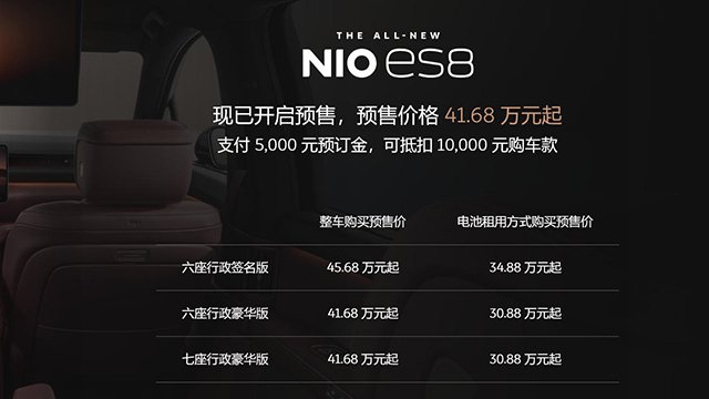 6座行政豪华版和7座行政豪华版,整车预售价均为41.68万元,电池租用方式购车为30.88万元起;6座行政签名版整车预售价为45.68万元,电池租用方式购车为34.88万元。新车将于2025年9月下旬正式上市并开启交付。