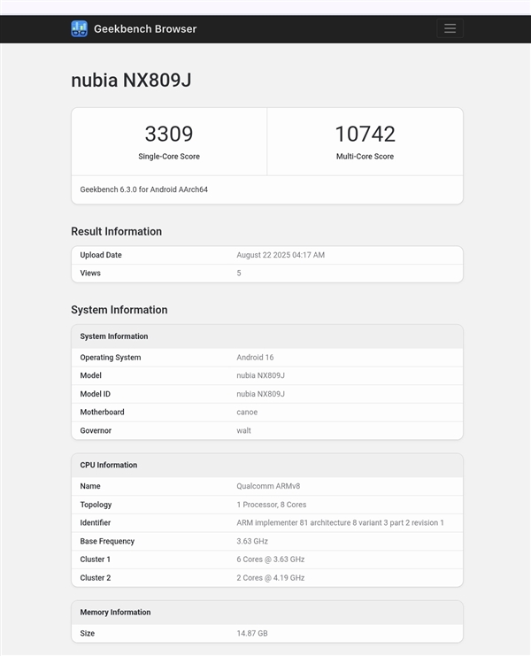 快科技8月22日消息,红魔11 Ultra现身Geekbench跑分网站,该机首批搭载高通骁龙8 Elite 2旗舰平台,单核成绩是3309,多核成绩是10742。