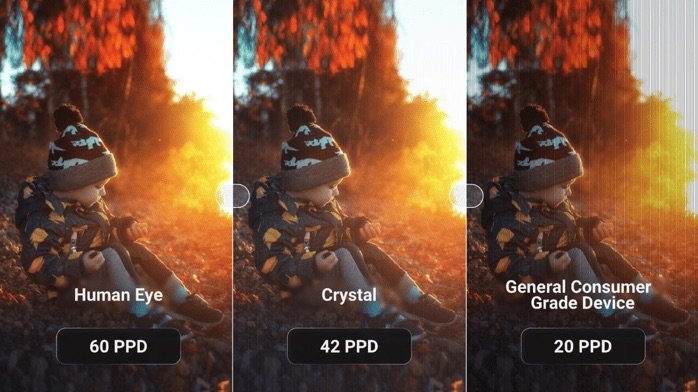 人眼在理想情况下分辨率大约是 60 PPD,也就是说,当头显的 PPD 达到或接近 60,人眼几乎就分辨不出像素点,看起来和真实世界差不多,当前很多主流 VR 设备的 PPD 在 20–30 区间,而 vivo Vision 探索版的 Micro-OLED 屏幕 PPD 达到了 38,共有 2728 万像素点。