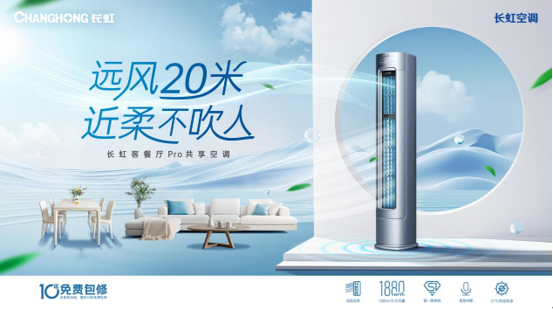 长虹空调针对此场景需求,升级推出客餐厅Pro共享空调,舒适感受、循环风量、智能体验、节能效果四大维度全面升级。独创“远投近柔”核心技术,完美解决客厅与餐厅的送风难题。20米超远距离送风能力,送风距离比普通柜机提升30%,即使在餐厅区域,也能快速均匀调温;而近处的风速则低于0.3m/s,通过微孔柔化气流,真正实现“远投近柔,舒适不吹人”。智能化操控同样领先行业。AI随声控2.0支持多指令连续识别,无需联网即可精准响应。