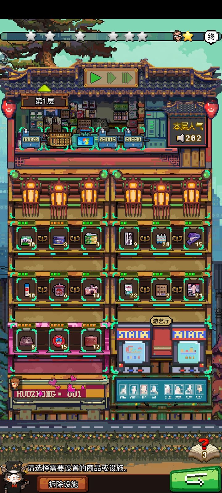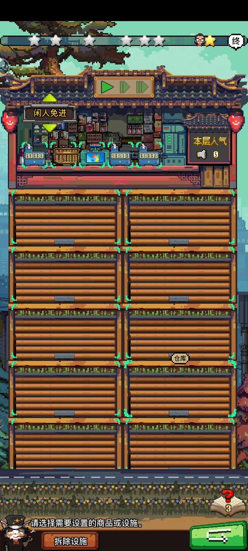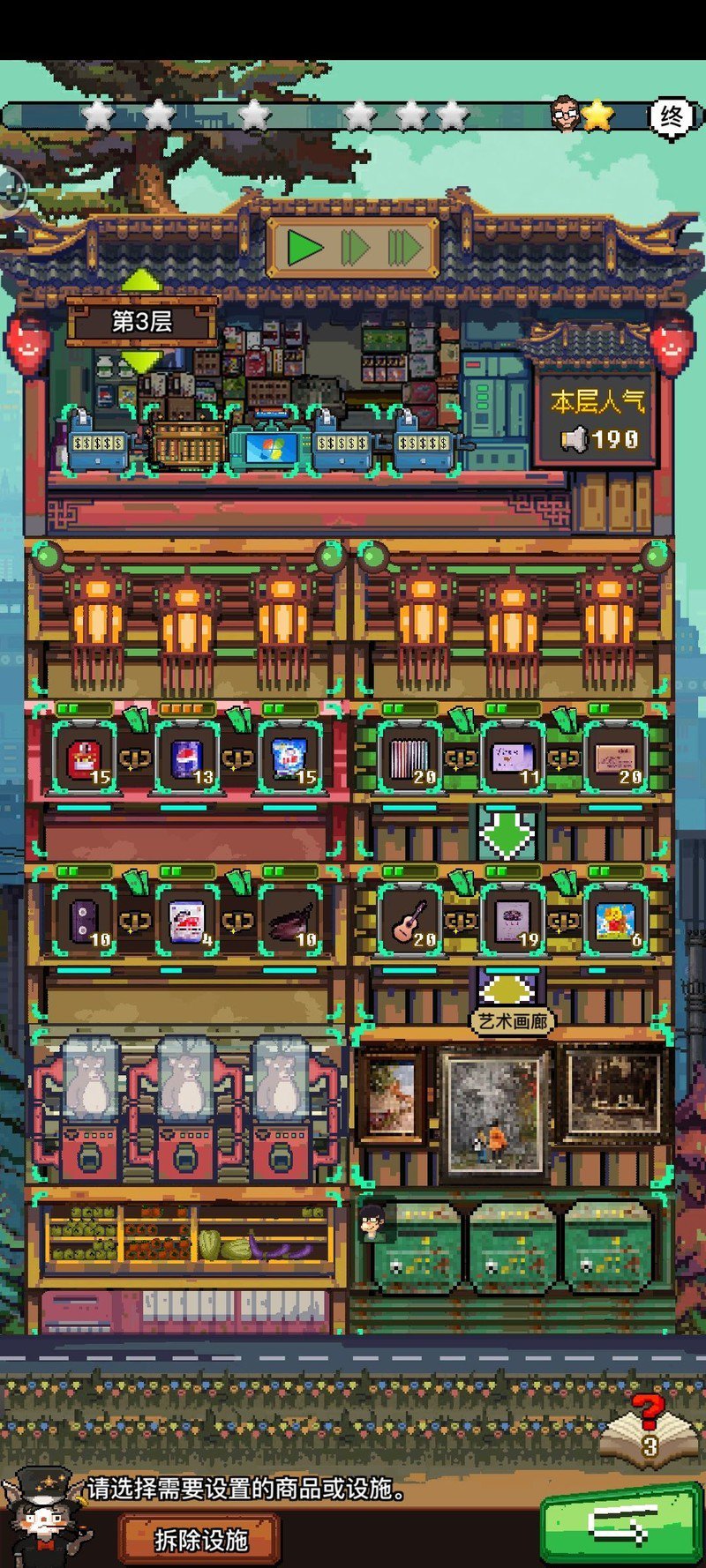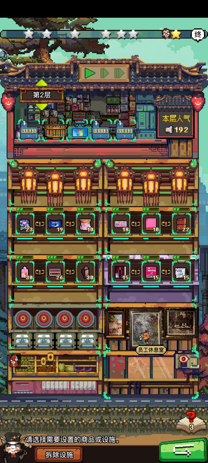 每天收入未达2000元、总收入未突破10000元时,不要扩建二层;总收益未到30000元前,不要扩建三层;未达40000元不扩建四层,依此类推。实际上,三层建筑已能满足通关需求,后期的高级商品如箭牌等,除非想继续游玩,否则并无必要发展。