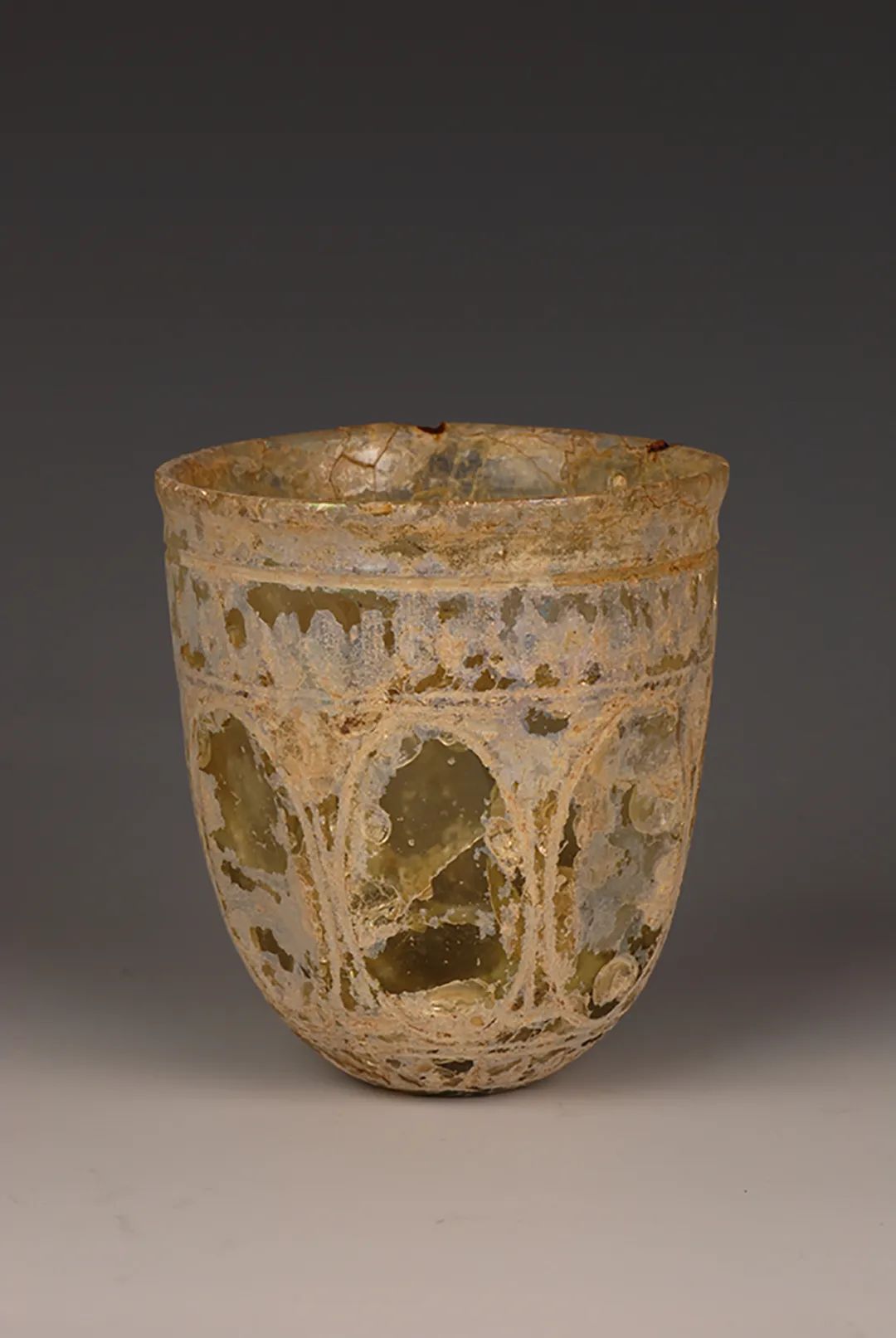 江苏南京象山7号墓出土玻璃磨花筒形杯。魏晋南北朝时期,罗马玻璃输入到中国的品种和数量都有增加。在南朝的政治、经济、文化中心南京附近,比较集中地出土了进口的罗马玻璃。图片来源:南京博物院官网
