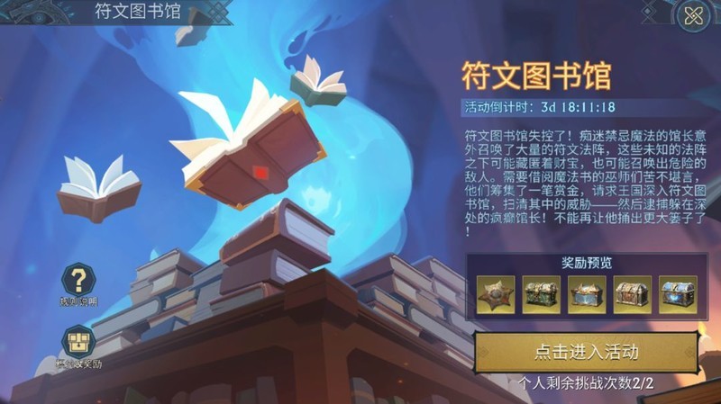 符文图书馆是一项周期性开放的挑战玩法,玩家可通过活动中心的入口参与。活动为期5天,前4天为挑战阶段,最后1天为奖励展示时间。参与活动可获得元素符文、阵灵精华宝箱、阵灵卷轴宝箱等奖励,是提升战力的重要途径。玩法包含多个难度选择,适合不同阶段的玩家参与。
