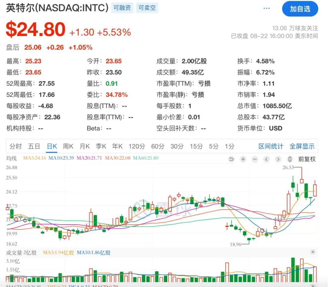 受此消息影响,在昨天的美股交易中,英特尔股价大幅上涨超过5%。