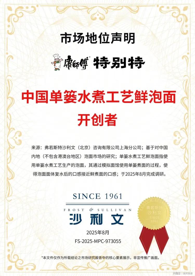 为了进一步夯实技术原点,康师傅还邀请第三方咨询机构沙利文对产品进行评估,确认“单篓水煮”工艺在当前行业中的原创性,并认定其为“中国单篓水煮工艺鲜泡面开创者”。这份背书也为“鲜泡面”成为独立品类提供了外部调研支撑。