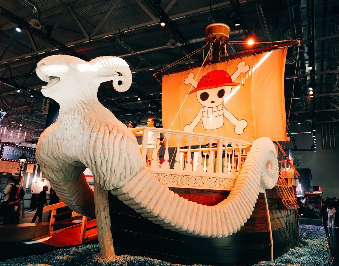 这里补充个背景,那就是Gamescom不同于国内游戏展,对于厂商展位搭建的高度限制很宽松,所以每年现场的“巨物奇观”造景都特别多。比如跟鹰角在同一个展厅的《海贼王》真人电视剧,就是搬了艘少说也有1:3还原的“黄金号梅丽号“来。