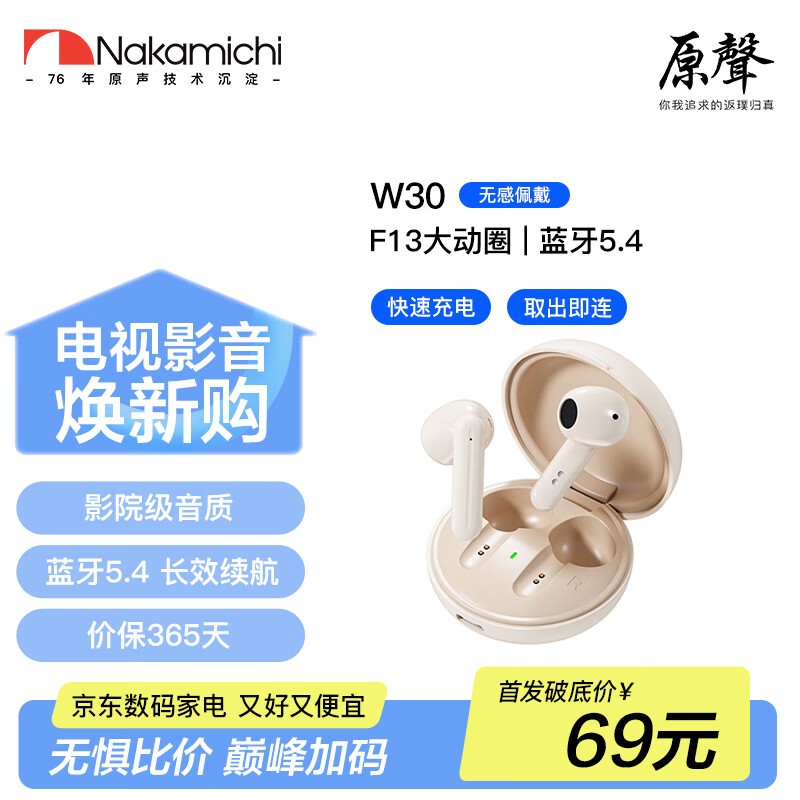 NAKAMICHI中道W30蓝牙耳机到手价69元可返现