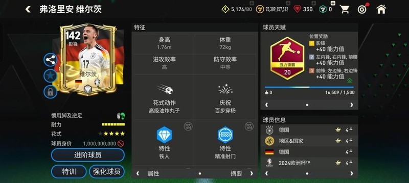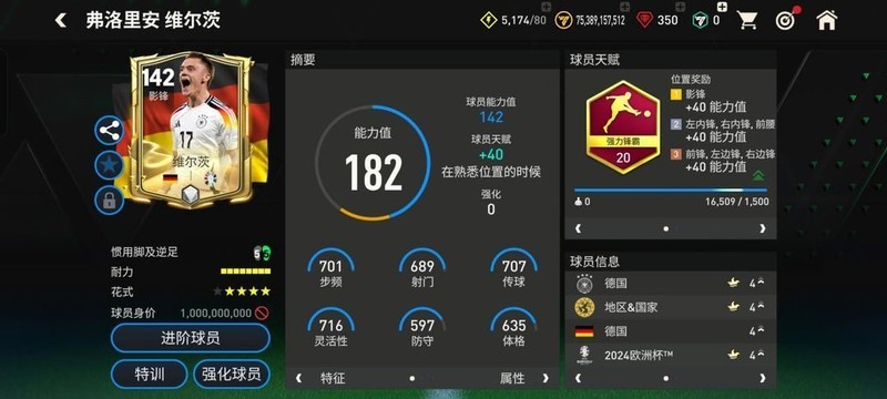 在数据表现上,24欧洲杯中的维尔茨基础能力值达到142,灵活性高达716,使他的突破动作更加流畅自如。本张维尔茨配备强力锋霸天赋,显著提升了他的加速、射门、抢点、头球以及力量五项关键属性。