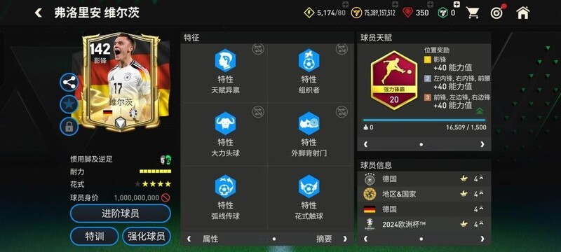 在特性方面,维尔茨具备铁人、精准射门、天赋异禀、组织者、大力头球、外脚背射门、弧线传球和花式触球共八项能力。精准射门有效提升了他插上射门的得分效率,而外脚背射门则丰富了他的射门手段,使进攻方式更加多样化。