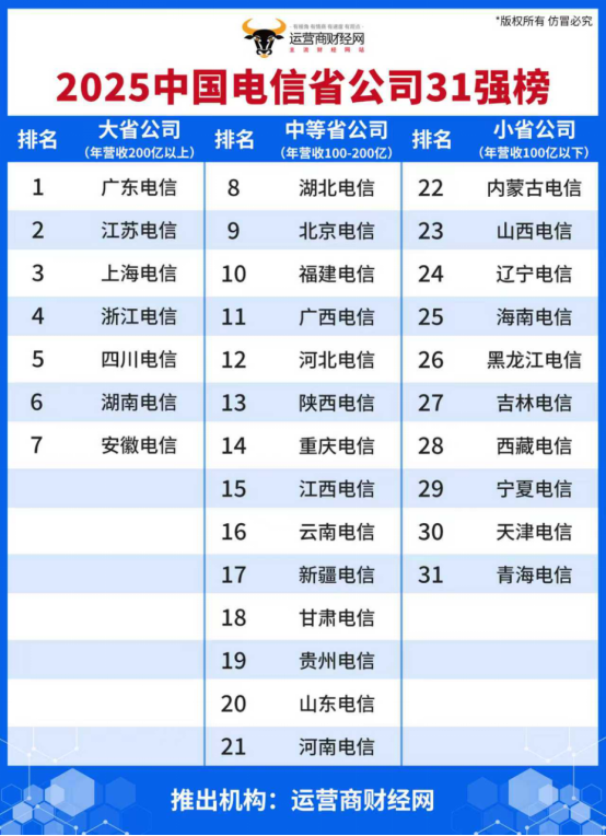 为让业界清晰了解三大运营商旗下各省公司的发展情况,由运营商财经网独家打造的“2025中国电信省公司31强”排行榜单正式出炉。