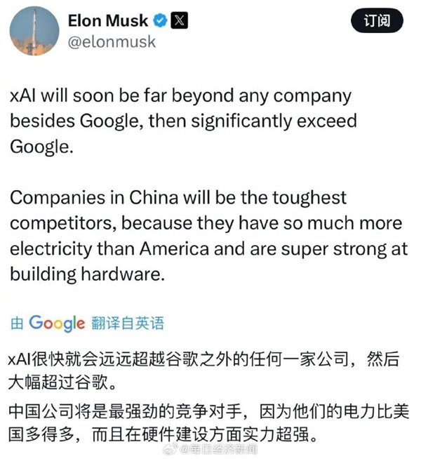 马斯克同时发表观点表示,xAI很快就会超越除谷歌外的任何公司,然后也将超越谷歌,“但中国公司将是最强劲的竞争对手,因为他们的电力比美国多得多,而且在硬件建设方面实力超强。”