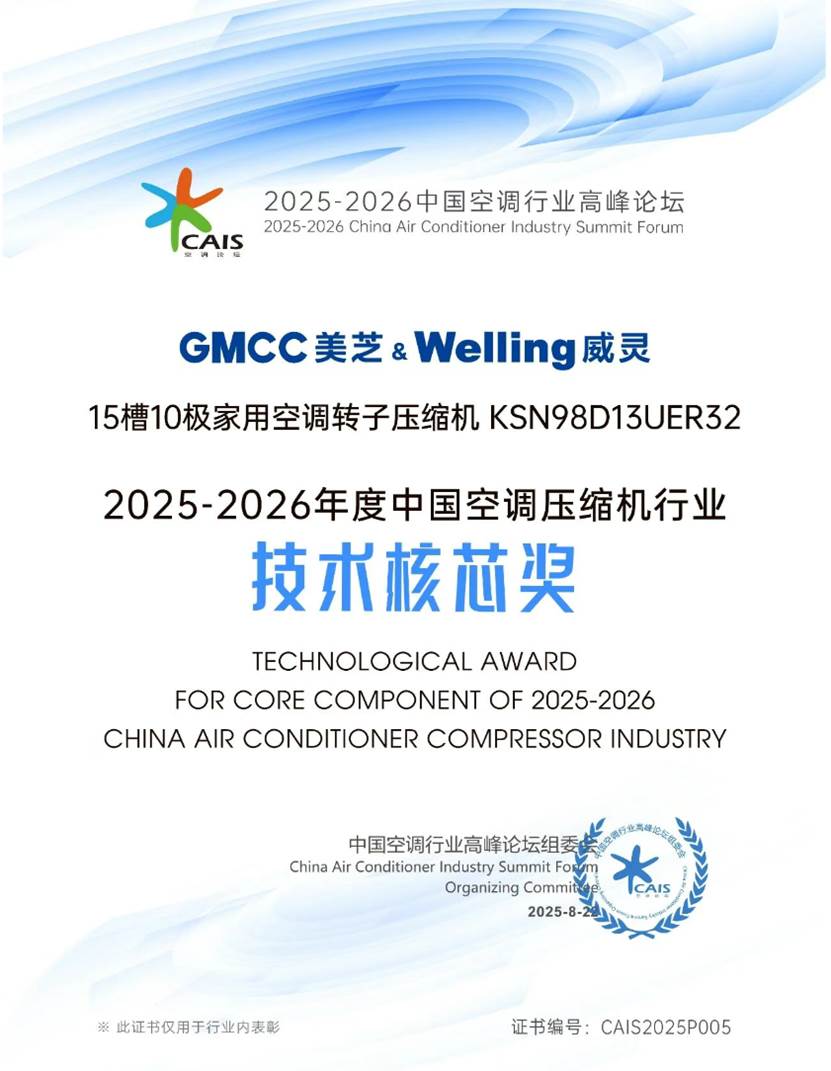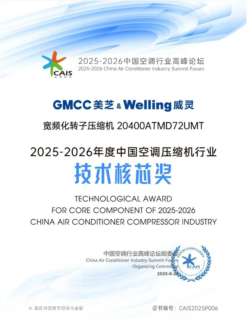 此次论坛,美芝、威灵荣获“2025-2026年度中国空调压缩机行业领军品牌”、美芝宽频化转子压缩机、美芝15槽10极家用空调转子压缩机荣获“2025-2026年度中国空调压缩机行业技术核芯奖”,展示了美芝、威灵在市场影响力、研发与技术突破上受到了行业肯定。