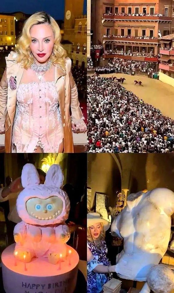 当天,麦当娜包下了意大利锡耶纳当地最顶级的场地,请来了国际一流的派对策划团队,从酒水、定制蛋糕,到舞蹈表演、璀璨烟火,样样俱全。