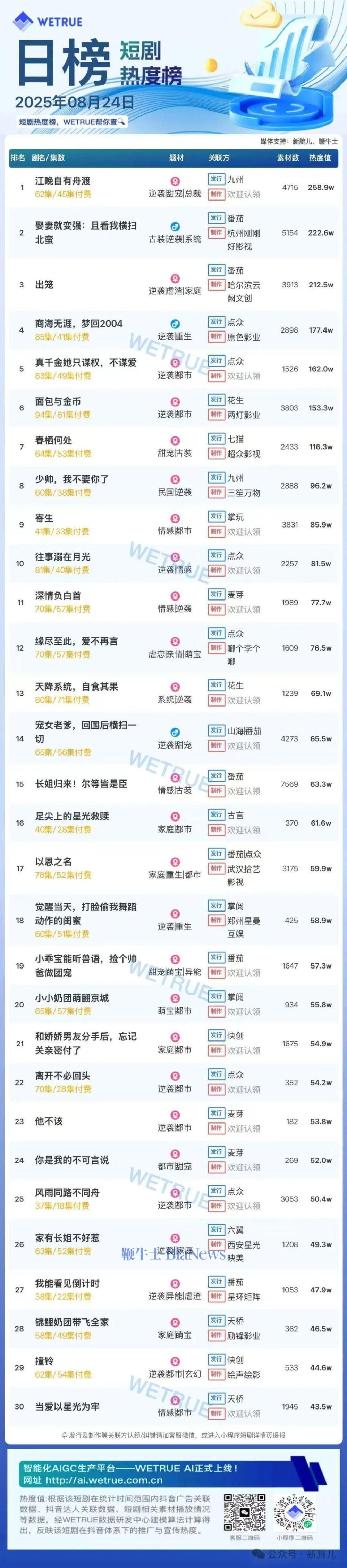 1、本日榜为WETRUE短剧数据公司提供,新腕儿和鞭牛士提供联合支持。
