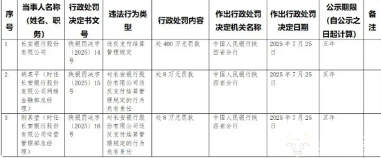具体来看,该行因“违反支付结算管理规定”被处罚400万元。与此同时,时任长安银行网络金融部总经理胡某平、时任长安银行运营管理部总经理荆某莹,因对该违法行为负有责任分别被罚了8万元。