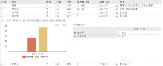 公司业绩亮眼,高管们的薪酬也十分可观。董事长程雪2024年薪酬高达913.5万元,相较于2023年的669.8万元,上涨了243.7万元,总裁管江华2024年薪酬为603.3万元,也远超行业平均水平。