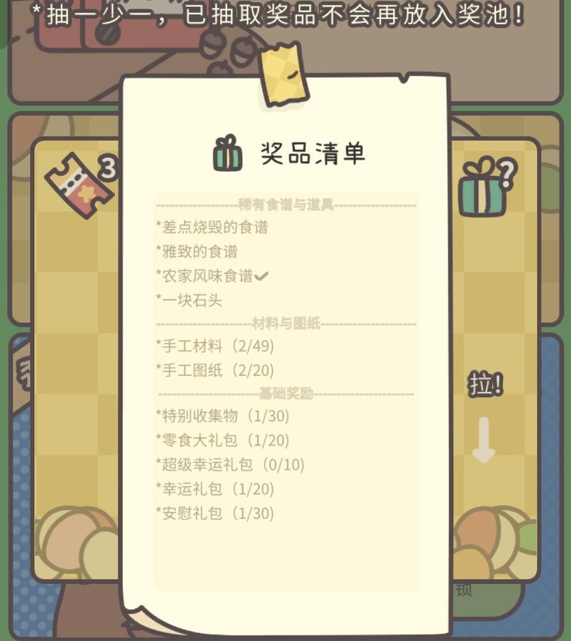 每五张抽奖券可抽一次扭蛋机,随机获得食谱。