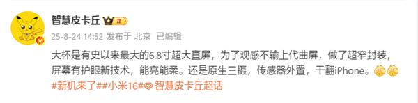 根据博主“智慧皮卡丘”的消息,该机是有史以来最大的6.8寸超大直屏,而且还做了超窄封装,观感不输上一代的等深四曲屏。