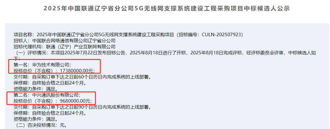 其中,第一中标候选人为华为技术有限公司,第二中标候选人为中兴通讯股份有限公司。