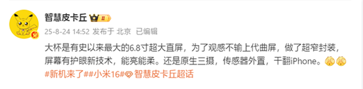 这款传闻中的小米16 Pro Max将搭载6.8英寸超大直屏,采用超窄边框封装工艺,视觉效果可媲美前代产品的等深四曲屏设计。值得注意的是,此次小米数字系列将实现全系直屏方案的回归,自小米9之后首次统一采用直屏设计,甚至后续可能推出的Ultra版本也将彻底摒弃曲面屏方案。业内分析认为,虽然等深四曲屏在握持手感与视觉沉浸感上达到平衡,但机身厚度控制、贴膜便利性等问题仍待优化,直屏方案或能带来更实用的使用体验。