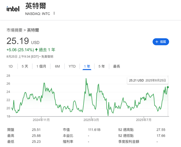 目前英特尔在股票市场公开的股价在 23-26 美元上下,刚才我们提到的,美国政府大批量购买股票的 “打包价” 是 20.47 美元。