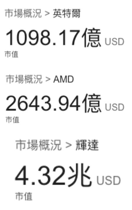 没有对比就没有伤害。10 年前, 10 个 AMD 和 10 个英伟达加起才等于一个英特尔,而现在 AMD 的市值是英特尔的 2 倍多,英伟达的市值快要到英特尔的 40 倍了。
