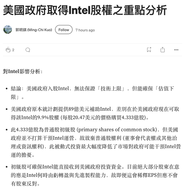 20 美元就意味着,如果英特尔哪天头铁,想放弃制造业,那么美国政府就能以白菜价,再多持有英特尔 5% 的股权。