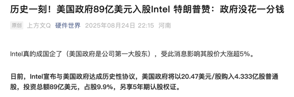 一觉醒来,美国政府用 89 亿美元的投资,正式成为英特尔的第一大股东,英特尔这下真成美国国企了?