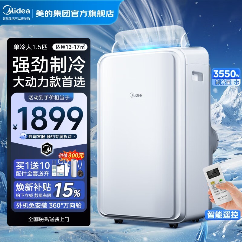 美的移动空调单冷一匹家用立式无外机设计,强劲制冷更便捷