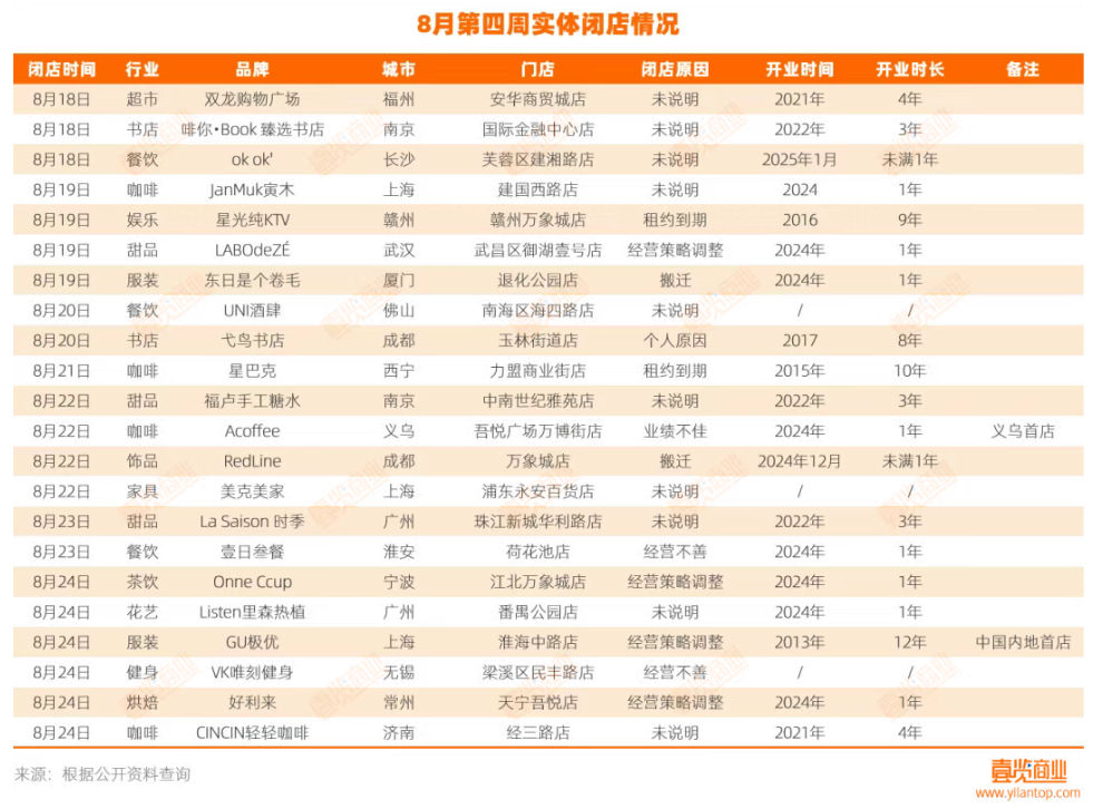 据壹览商业不完全统计,8月第四周,共22个连锁品牌关闭了至少22家门店。