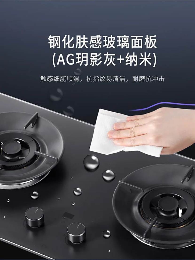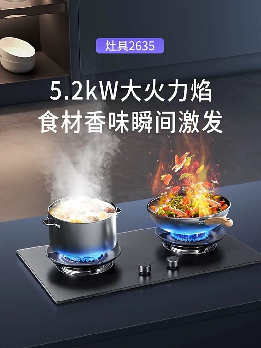 灶具2635采用AG玥影灰+纳米钢化肤感玻璃面板,抗污易擦;双层中空聚能炉架高效防风、适配多锅具;瞬燃点火与下进气结构,点火快稳、燃烧充分不黑锅,做饭体验拉满,轻松拿捏理想烹饪新体验。
