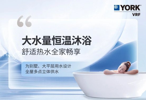 大水量恒温沐浴体验,更是家庭舒适的体现。约克VRF全屋中央热水系统配备室外大主机与大容量水箱,储水多产水快,专为豪华别墅、奢阔大平层居住人群设计,满足多楼层、多浴缸、多洗手间家庭的生活热水需求;多点立体供水,实现自由布局便捷舒适,使用承压式中央热水系统,实现全屋多点多路立体供水,多人使用,再大用水量,都能保持水压稳定,给你五星级酒店般便捷舒适的热水体验;恒温热水,用水不会忽冷忽热,创新智感耦合控温技术与水箱360°聚热锁温技术,水温精准控制,出水不凉不烫刚刚好,还能保持热水持久温热,拒绝忽冷忽热;双擎混动速热、紧急用水热得快,同时搭配零冷水功能,应对紧急用水与即开即热需求,随时畅享舒适热水。