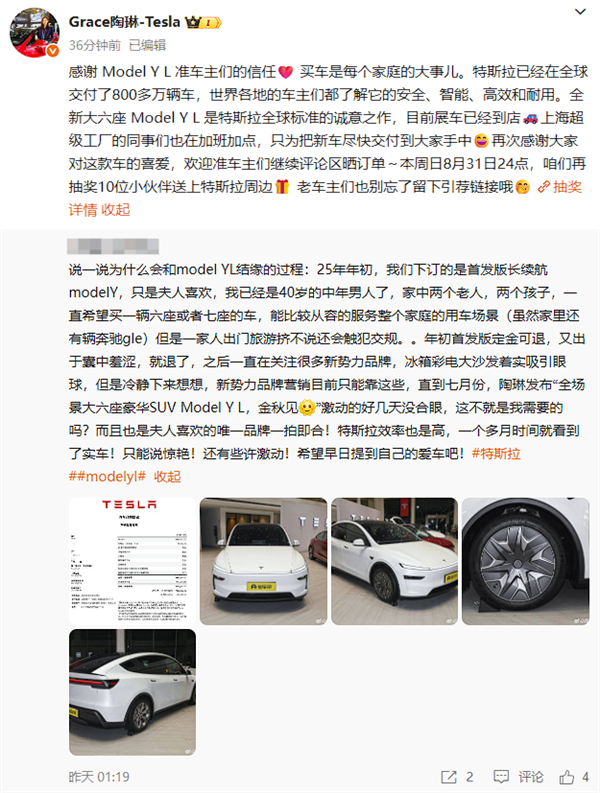 近日,有特斯拉Model Y L准用户讲述了自己的购车心路历程,甚至特斯拉公司副总裁陶琳都转发感谢,其表示: