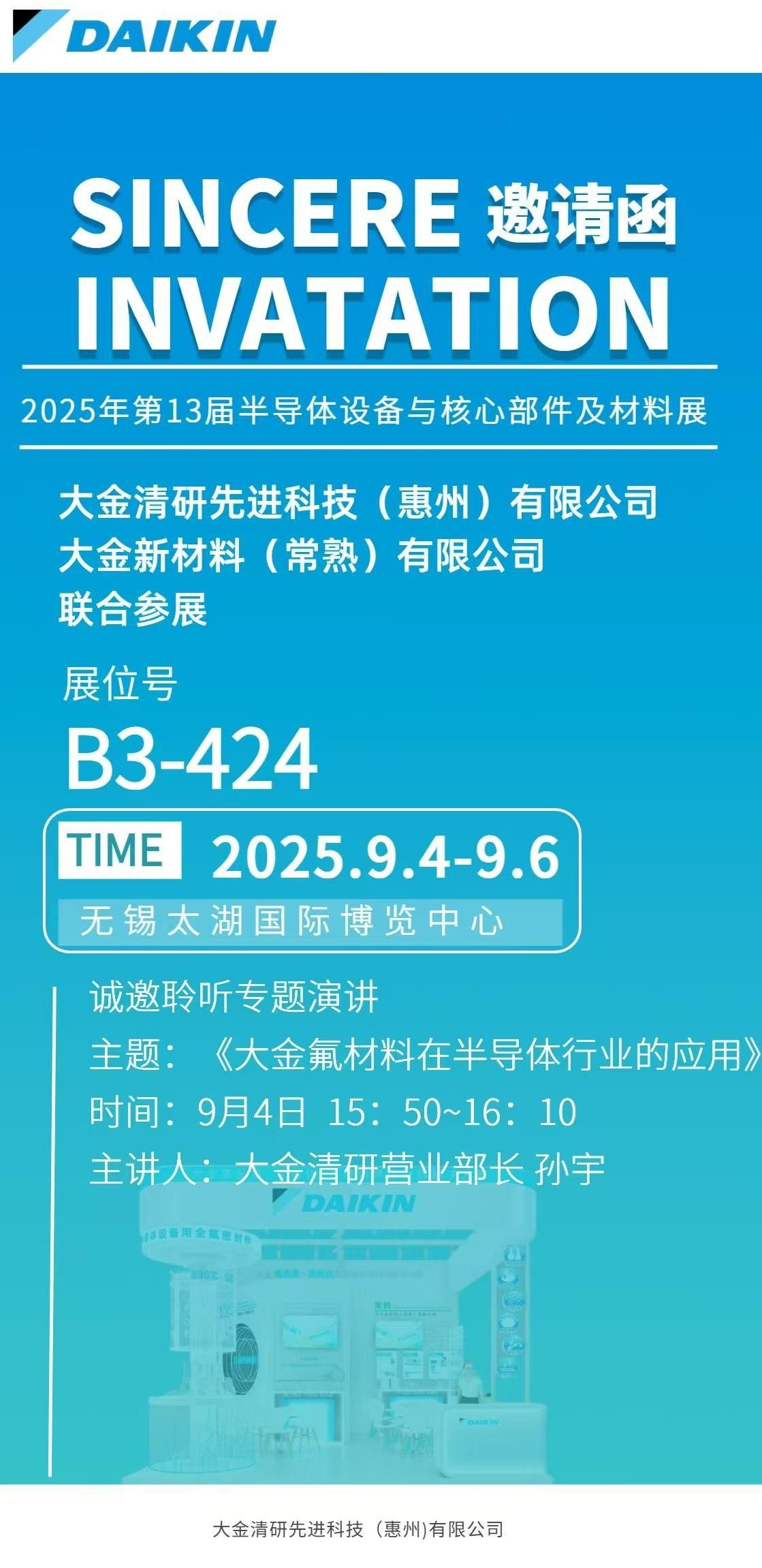2025年9月4日至6日,大金清研先进科技(惠州)有限公司与大金新材料(常熟)有限公司在第十三届半导体设备与核心部件及材料展上首次联合亮相。双方以高品质、在地化的先进半导体材料解决方案为核心,充分彰显大金在半导体领域的技术积累与全链路服务能力,赢得业界积极关注与高度评价。