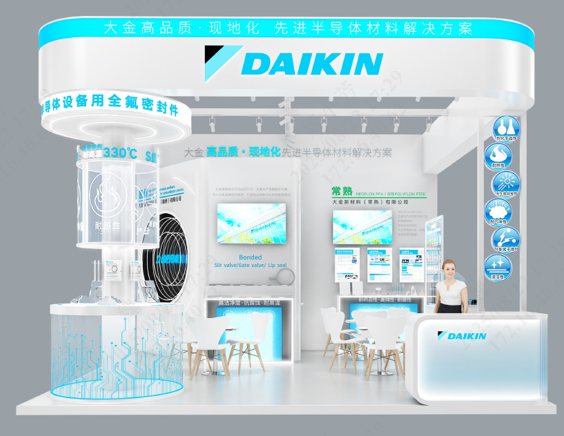 作为联合参展方,大金新材料(常熟)有限公司同步展出三大半导体核心材料:NEOFLON PFA(适用于接头阀门、管子及晶片花篮)、POLYFLON PTFE(用于内衬与隔膜片)以及改性 PTFE 玻纤复合板(专为储罐和管道设计)。与大金清研的密封材料协同,这些产品贯穿半导体工厂从输送、制造到存储的全链条环节,进一步构建起完整而具竞争力的大金半导体解决方案。