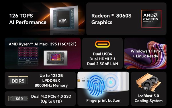 锐龙AI Max+ 395本身的规格就不用赘述了,16核心32线程、126 TOPS AI算力、Radeon 8060S GPU集显等都是几乎无敌的存在。