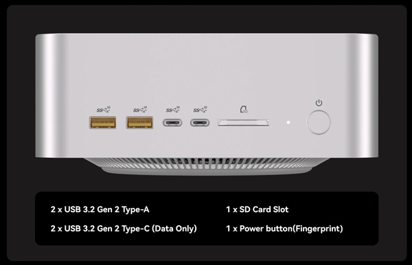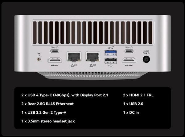 其他方面,它配备两个USB4、两个USB-C 3.2 Gen2、三个USB-A 3.2 Gen2、一个USB 2.0、两个HDMI 2.1 FRL、两个2.5G网口、一个3.5mm耳机孔、SD读卡器、19V DC供电接口、指纹识别电源键。