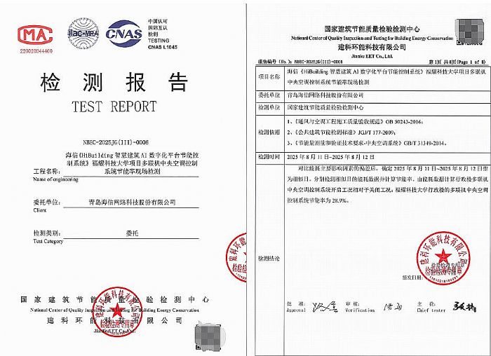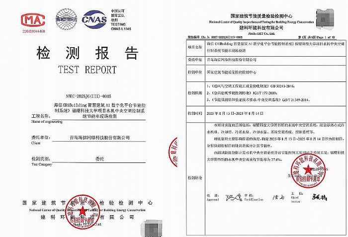 近日,由国家建筑节能质量检验检测中心主导的“海信HiBuilding智慧建筑AI数字化平台节能控制系统”福耀科技大学项目节能率现场检测顺利完成。检测数据显示,该校图书馆水机中央空调控制系统节能率达27.6%,行政楼多联机中央空调控制系统节能率更是高达28.9%,显示出海信智慧建筑AI节能系统在实际应用中的卓越性能。