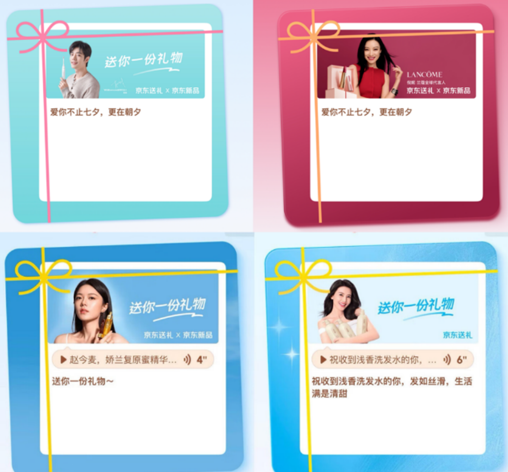 此外,京东还推出“明星定制送礼封面”玩法,通过与超40位明星、超80个品牌的深度合作,消费者使用京东“一键送礼”功能,不仅可以享受送礼优惠,还能解锁张艺兴、杨紫等明星的七夕祝福贺卡,下单指定新品更有惊喜明星独家语音祝福。8月27日至29日,购物时选择“一键送礼”功能,订单金额满 99 元,还有机会以0.01元的价格购得七夕京东独家MCM联名帆布袋。