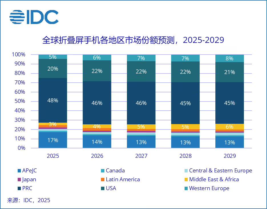 IDC称,自2023年起,中国正式超越其他市场,成为全球最大的折叠屏手机市场。依托成熟的本土供应链体系、消费者对前沿科技的高接受度,以及厂商对用户需求的精准捕捉,中国在折叠屏手机的市场主导地位将长期稳固。