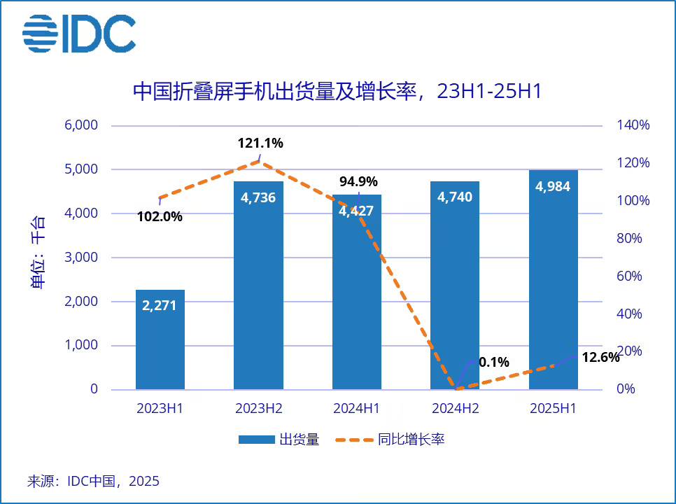 8月26日,国际数据公司(IDC)最新发布的手机季度预测报告显示,2025上半年,中国折叠屏手机出货量达到498万台,同比增长12.6%。报告预计,2025年全球折叠屏手机市场出货量约1983万台,同比增长6%;2025年中国折叠屏手机市场出货量预计达 947 万台,同比增长3.3%,基本与去年持平。