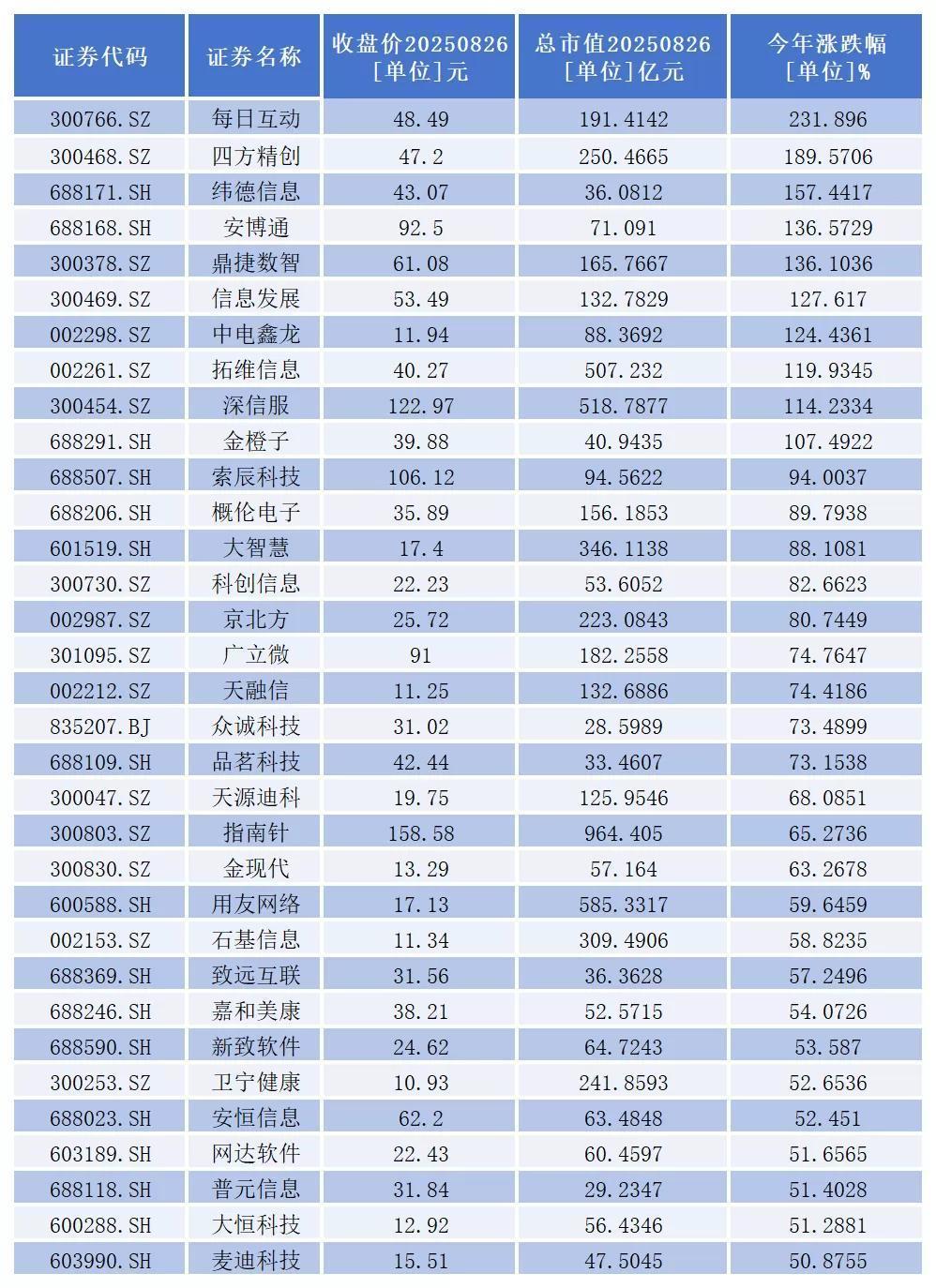 同花顺数据显示,截至8月26日收盘,A股软件开发板块一共有139只概念股。从二级市场表现看,今年以来,有121家上市公司股价出现上涨,其中涨幅超过50%的有33家。