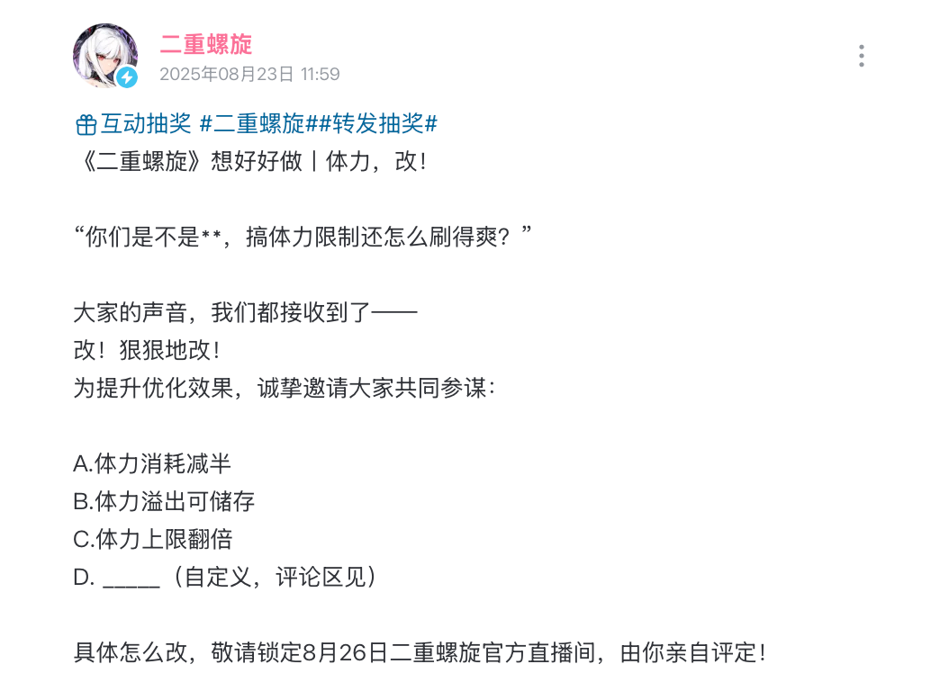 玩家也基本秉持开窗理论——如果想要别人给你开窗,那就应该诉求拆掉屋顶——坚决呼吁取消抽卡,删除体力。可以明显感觉到玩家对此基本并不抱希望,语气也近似于调侃,更多是希望以此表示出态度,并力所能及争取厂商的更多让步。只是没想到,《二重螺旋》虚晃一枪,确实超出预期地把屋顶给掀了。