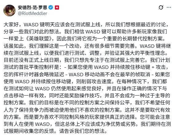 如今,《英雄联盟》总监Andrei van Roon在个人社交媒体上发文表示该操作方式将于明日上线测试服,并公布了几项平衡方案。