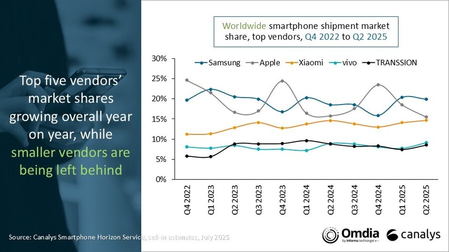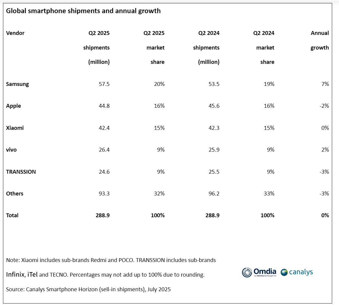 根据Canalys最新研究,2025年第二季度全球智能手机出货量微降至2.889亿部,温和的消费者需求抑制了市场增长。Samsung以5750万部出货量成为本季度排名第一的厂商,同比增长7%,其表现主要受面向大众市场的Galaxy A系列驱动。Apple位列厂商排名第二,iPhone出货量下降2%,达到4480万部。Apple在中国面临激烈竞争及美国库存调整的背景下仍展现出强劲韧性。小米凭借拉丁美洲和非洲的突出增长,以4240万部出货量守住第三名。vivo以2%增速位列第四(出货量2640万部),印度市场强劲增长构成支撑;TRANSSION出货量下降3%,达到2460万部,排名第五。