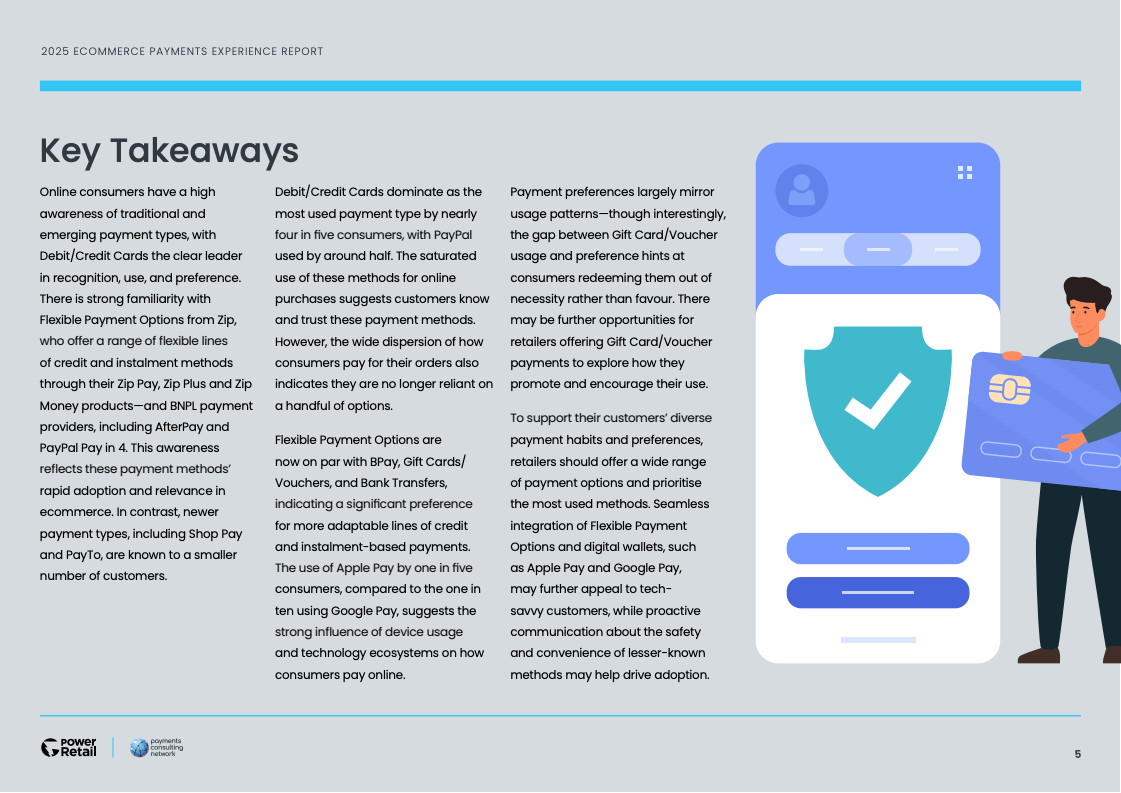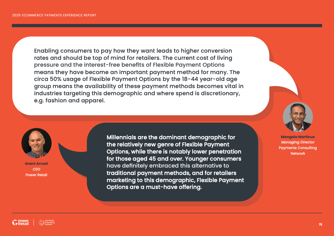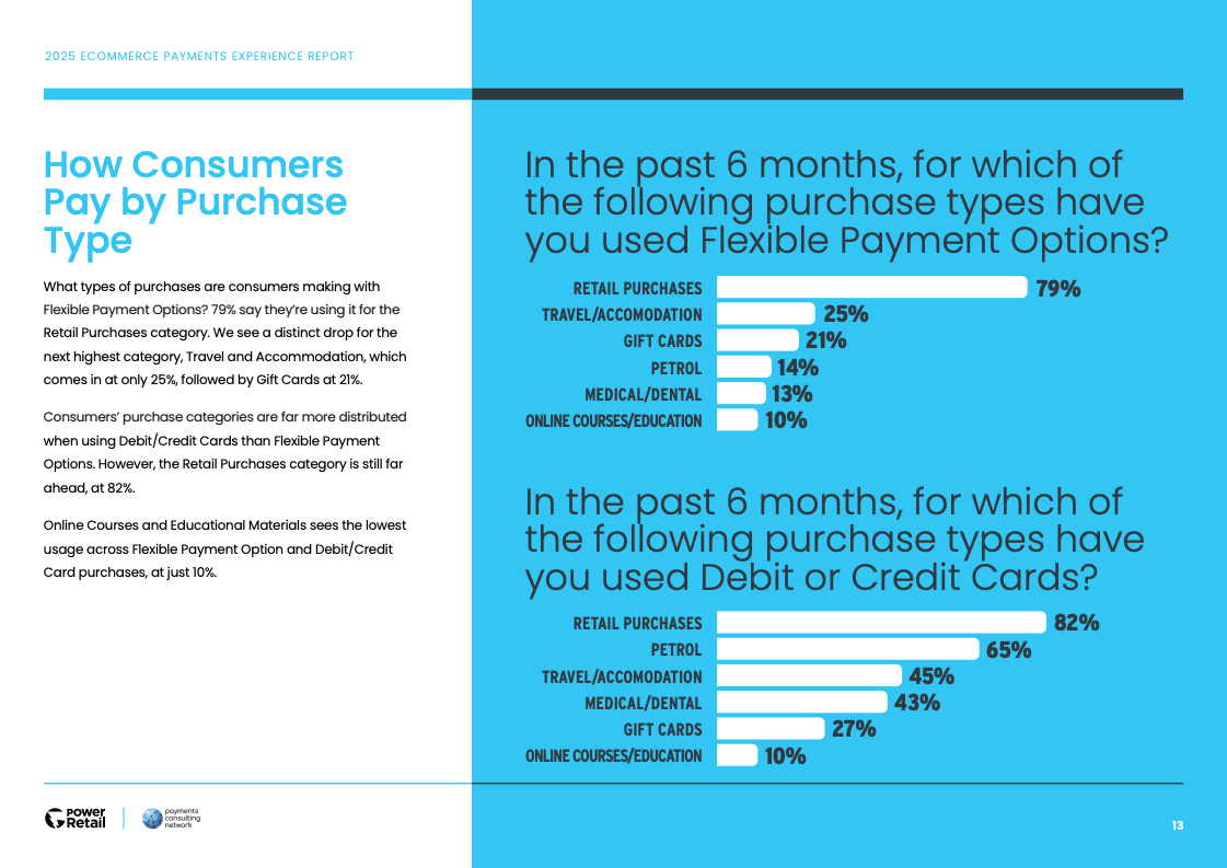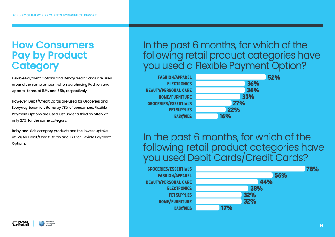消费者的支付选择呈现出明显的场景化与策略性。灵活性支付主要被用于非必需的零售消费(79%),尤其是在时尚服饰(52%)等品类。相比之下,高达78%的消费者在购买食品杂货等生活必需品时,仍倾向于使用传统的借记卡或信用卡,反映出不同支付工具在消费者心智中的差异化定位。
